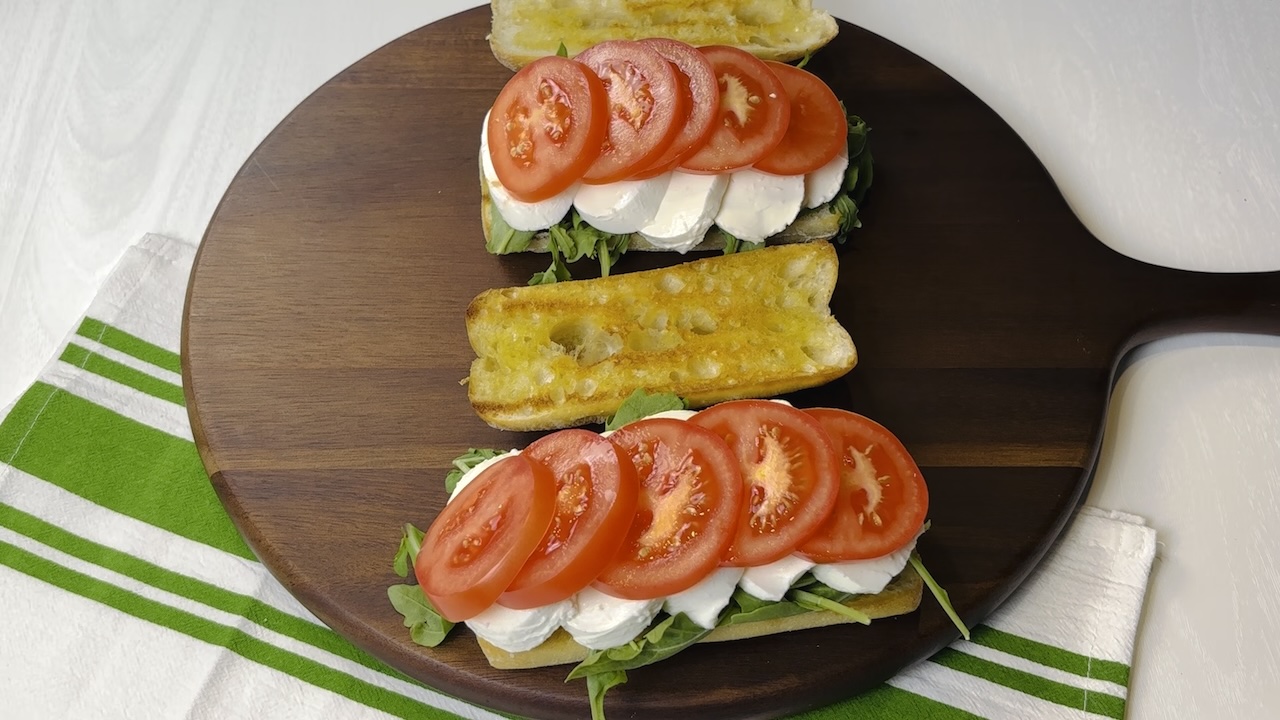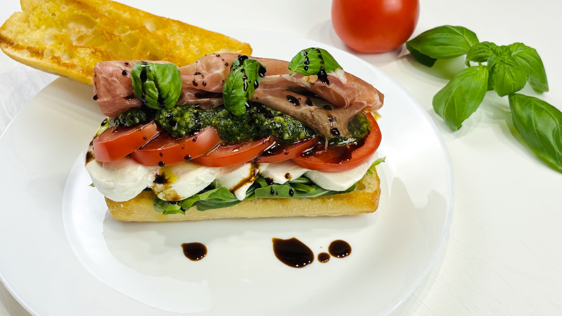 Finally, if you’d like a little extra flair, garnish the top half of the ciabatta with a few fresh basil leaves for color and aroma. Serve immediately while everything is fresh and perfectly layered.