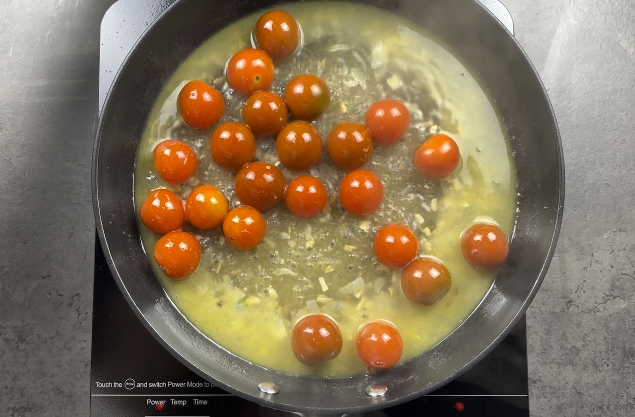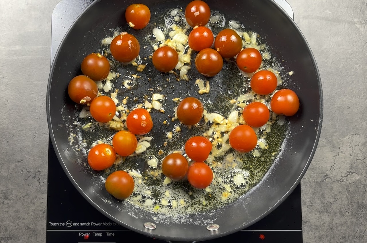 Add the halved cherry tomatoes to the skillet and cook for 5-7 minutes, stirring occasionally.