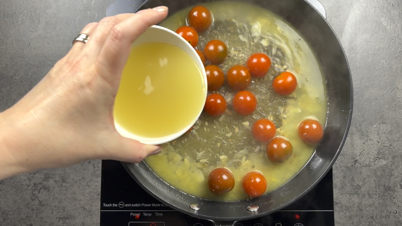 Add in the fish or chicken broth and simmer for about 5-6 minutes or until all the tomatoes releases the juices.