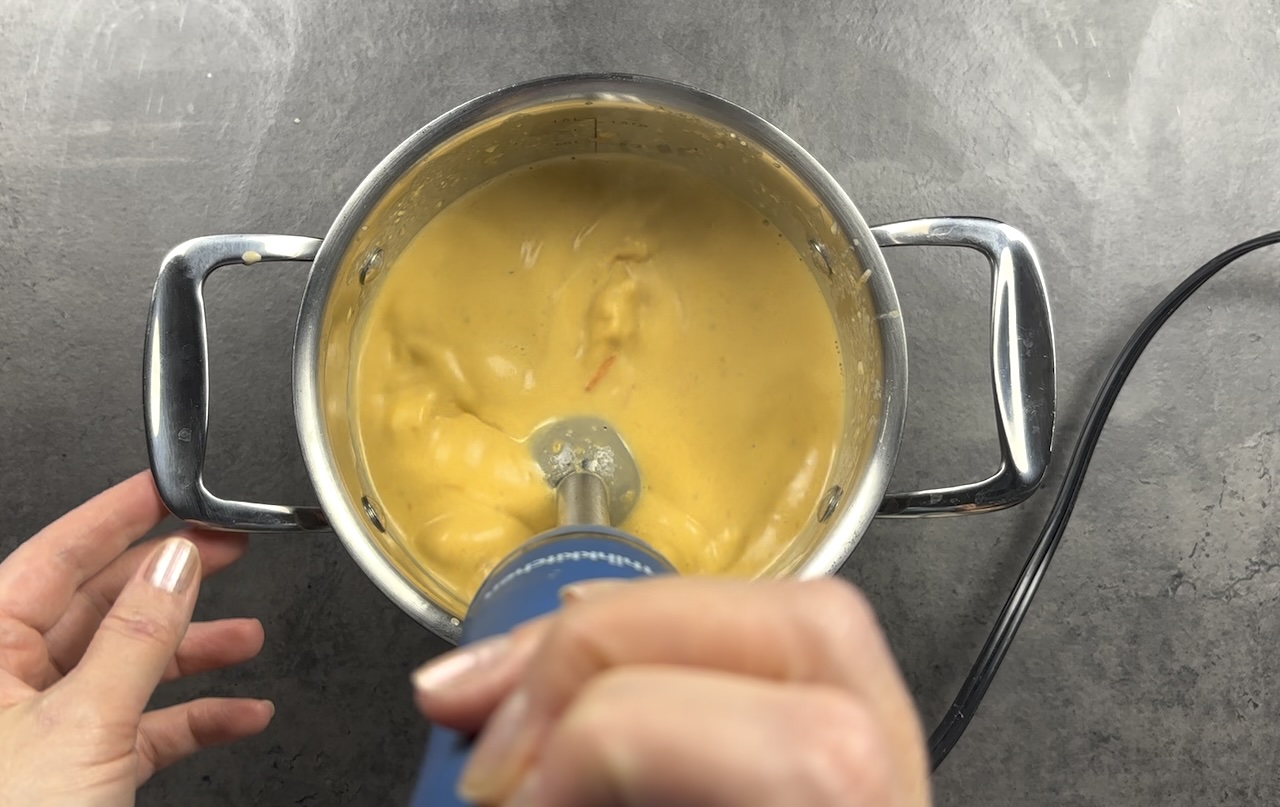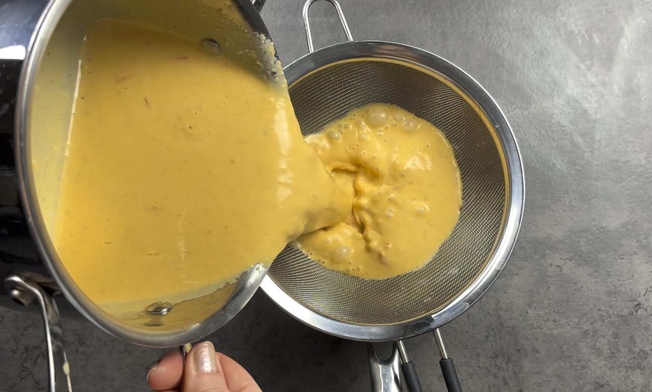Using an immersion blender, purée the sauce until smooth, then strain it to achieve a velvety texture. Keep the sauce warm over low heat while you cook the tortellini.