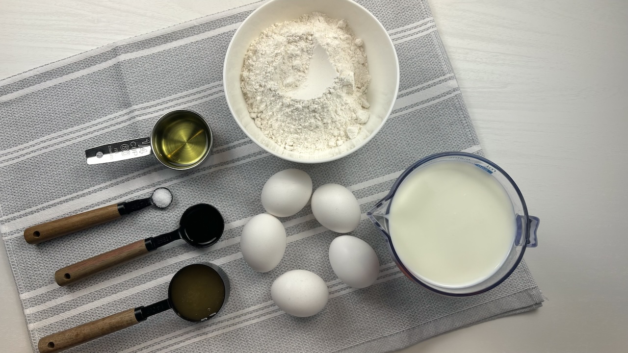 In a large mixing bowl, whisk together the eggs, honey, and vanilla extract until fully combined. Sift in the flour and salt, then mix until the batter is smooth and lump-free. Gradually add the milk and continue whisking until smooth. Finally, stir in the vegetable oil.
