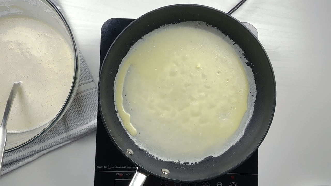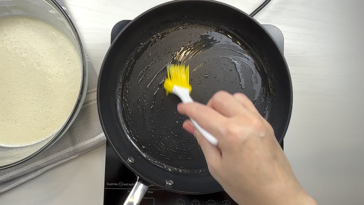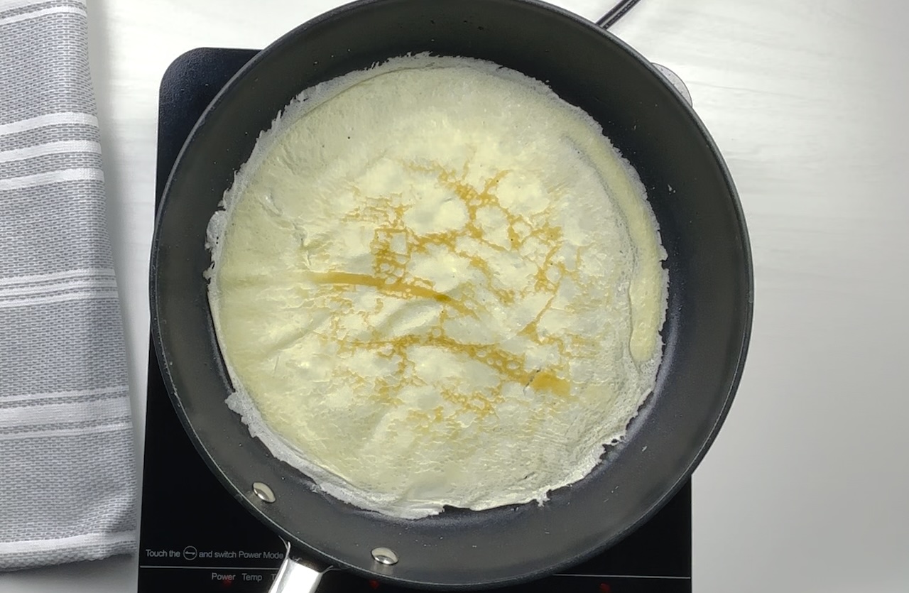 Heat a non-stick skillet or crepe pan over medium heat. Lightly grease the pan with a small amount of oil or butter.