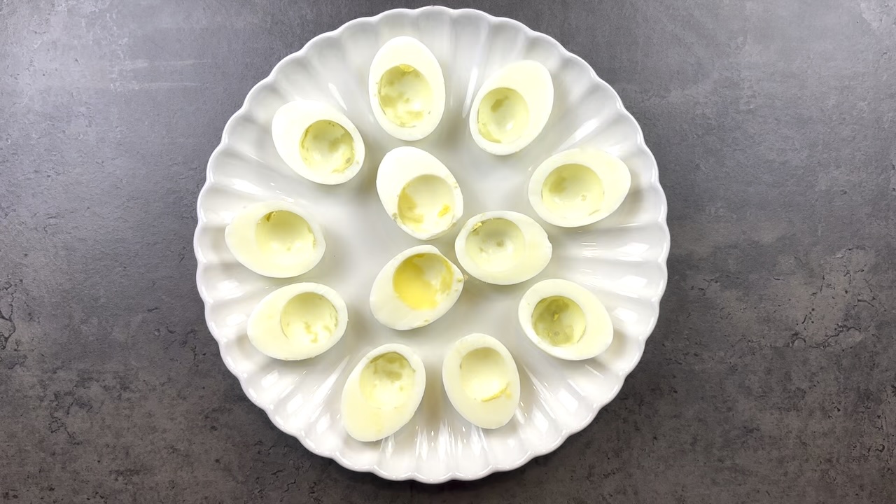 Slice the hard-boiled eggs in half lengthwise. Gently remove the yolks and place them in a small mixing bowl. Arrange the egg whites on a serving platter, cut side up.