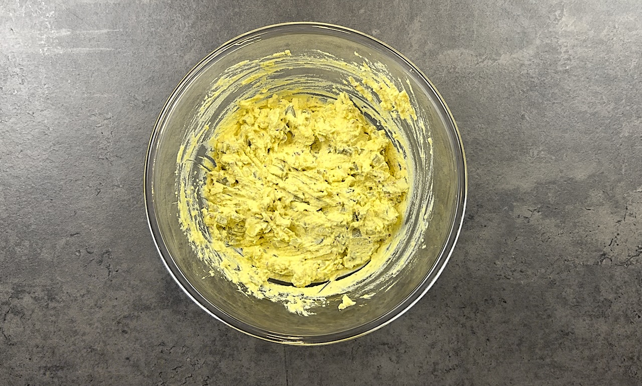 Mash the yolks with a fork until smooth. Add the mayonnaise, Dijon mustard, lime juice, minced pickle, salt, and pepper. Mix well until the filling is creamy and evenly combined. Taste and adjust seasoning if needed.