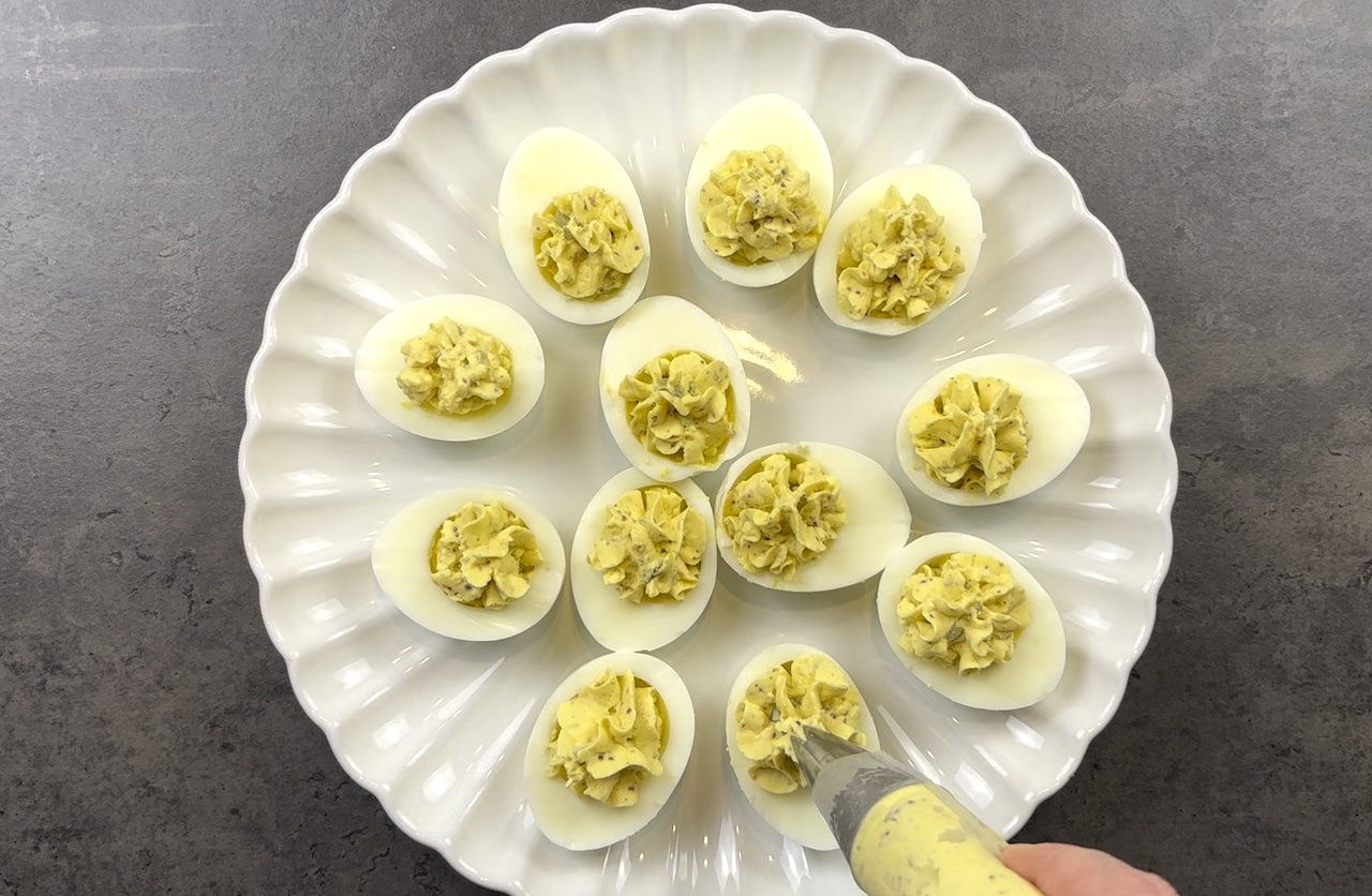 Using a small spoon or a piping bag fitted with a star tip, fill the hollow centers of the egg whites with the yolk mixture.