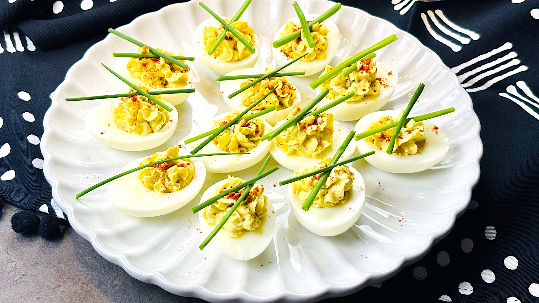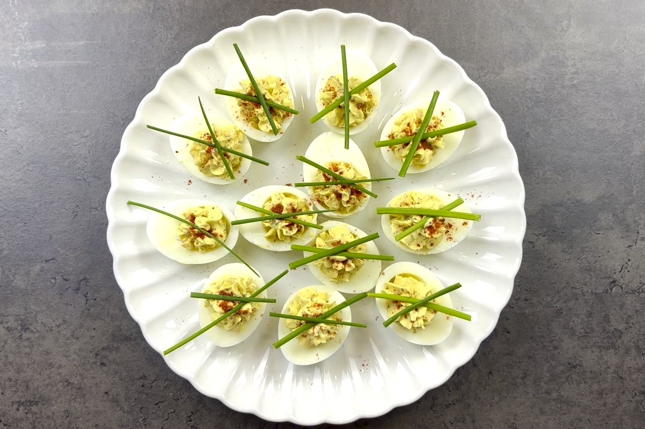 Lightly sprinkle paprika over the tops for a pop of color. Finish by adding a few finely chopped chives to each egg for an elegant touch.
