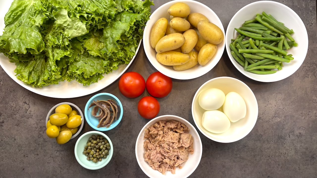 Arrange the drained tuna, tomato wedges, hard-cooked eggs, olives, capers, anchovy fillets, cooked potatoes, and blanched green beans neatly on top of the lettuce. For a traditional presentation, place each ingredient in separate sections for a visually appealing layout.
