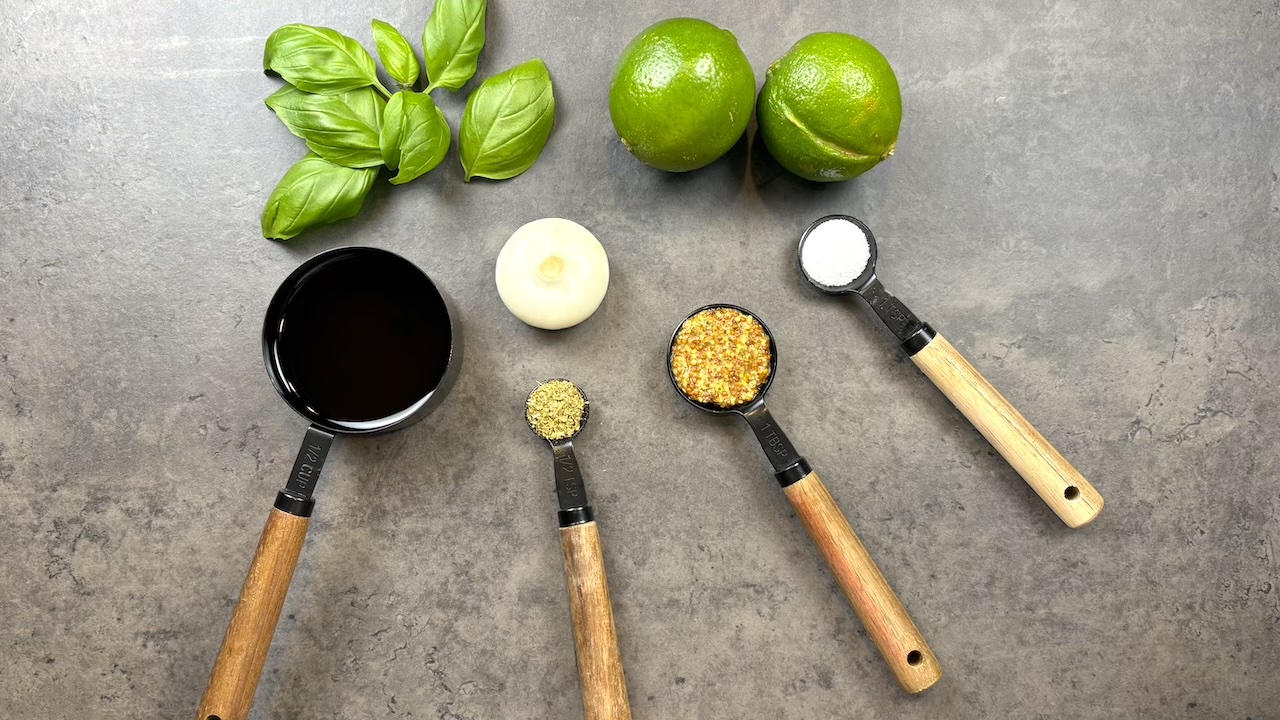 In a small bowl, whisk together the lime juice, olive oil, minced shallot, fresh basil, oregano, Dijon mustard, salt, and black pepper. Whisk until all the ingredients are well combined and the dressing is smooth.