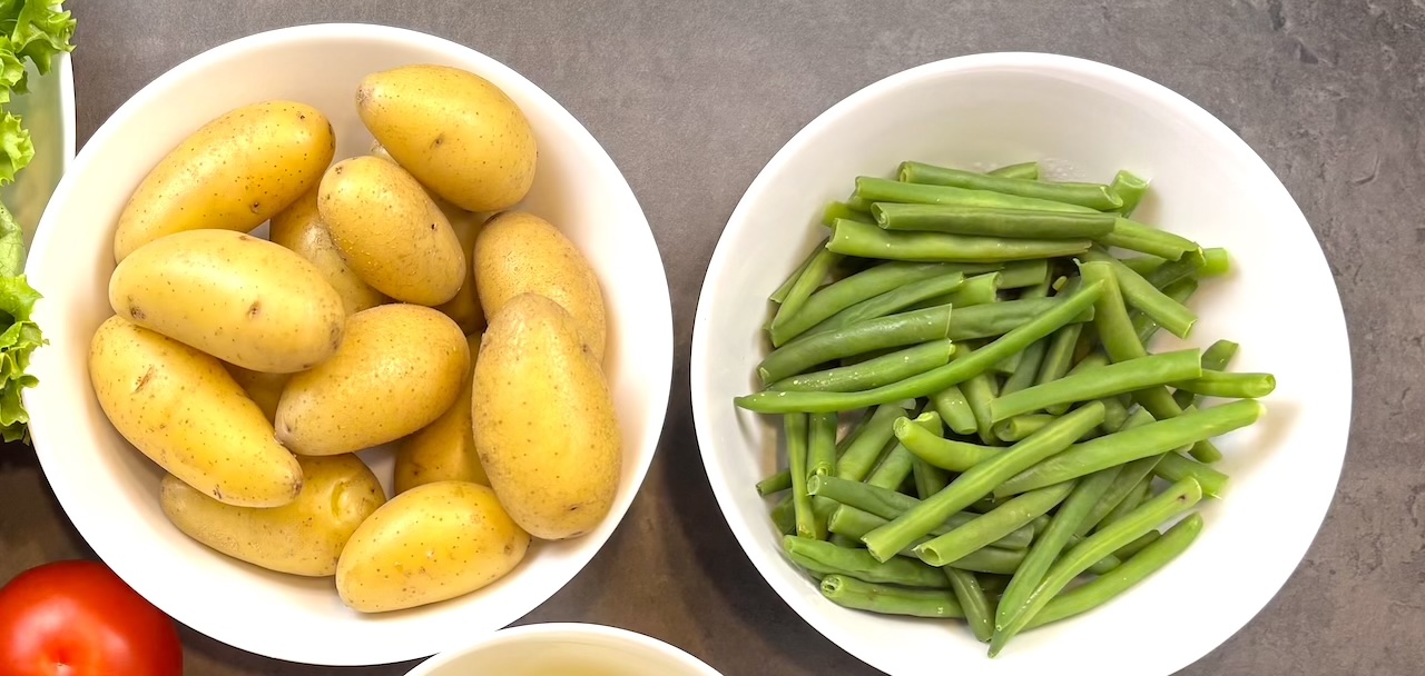 Cook the small potatoes in boiling water for 12–15 minutes or until fork-tender. Using the same pot, add the trimmed green beans and blanch them for 2–3 minutes until bright green and tender-crisp. Drain both and set aside to cool.