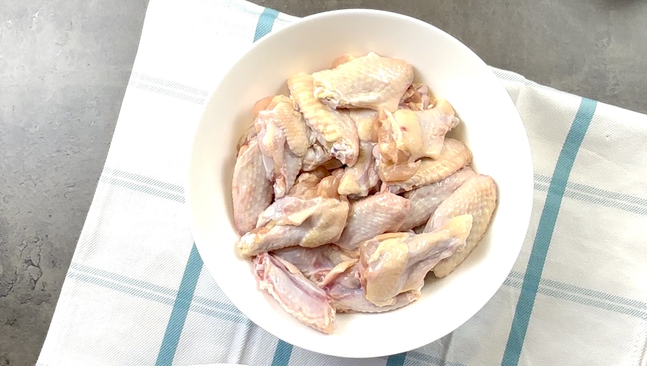 Pat the chicken wings dry with a paper towel and place them in a large mixing bowl.