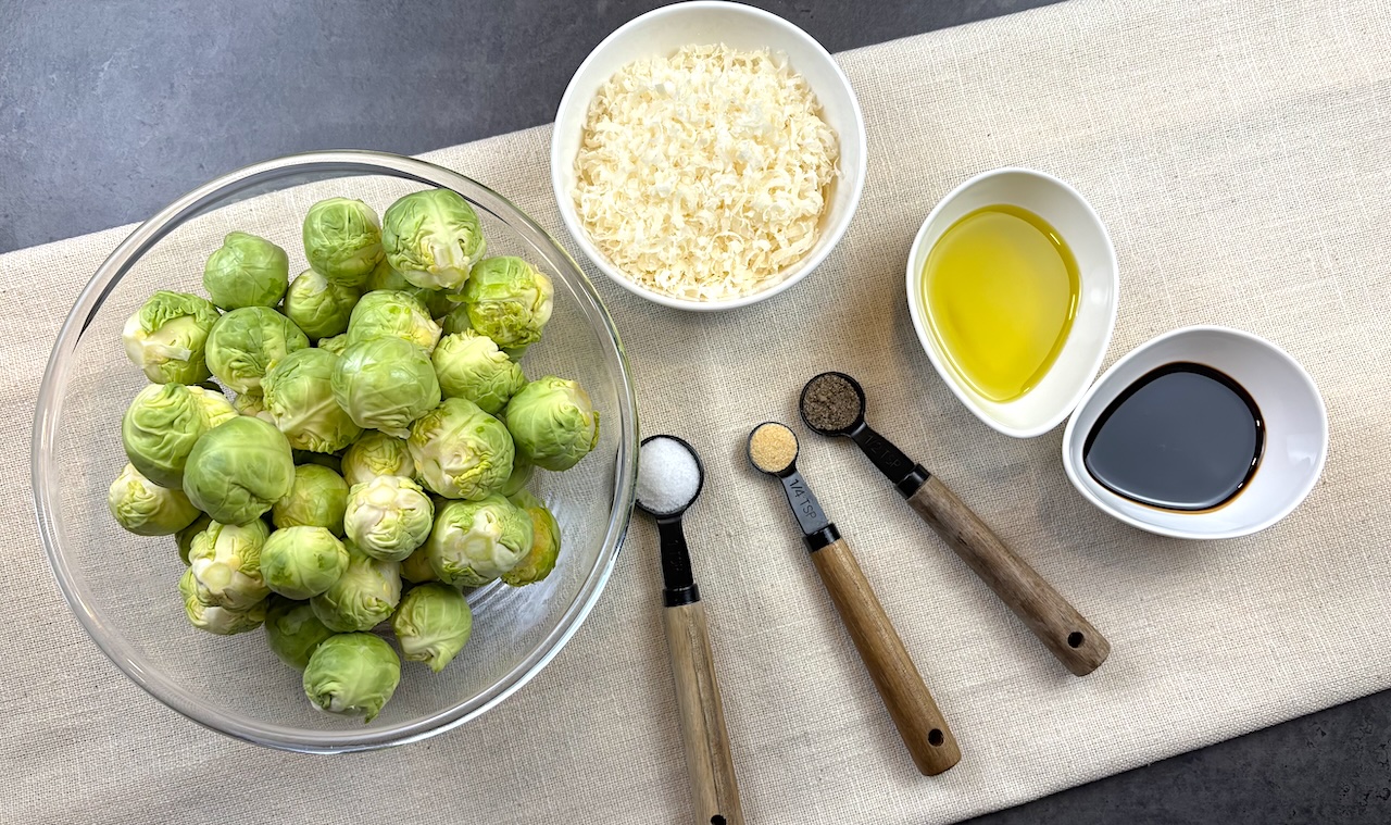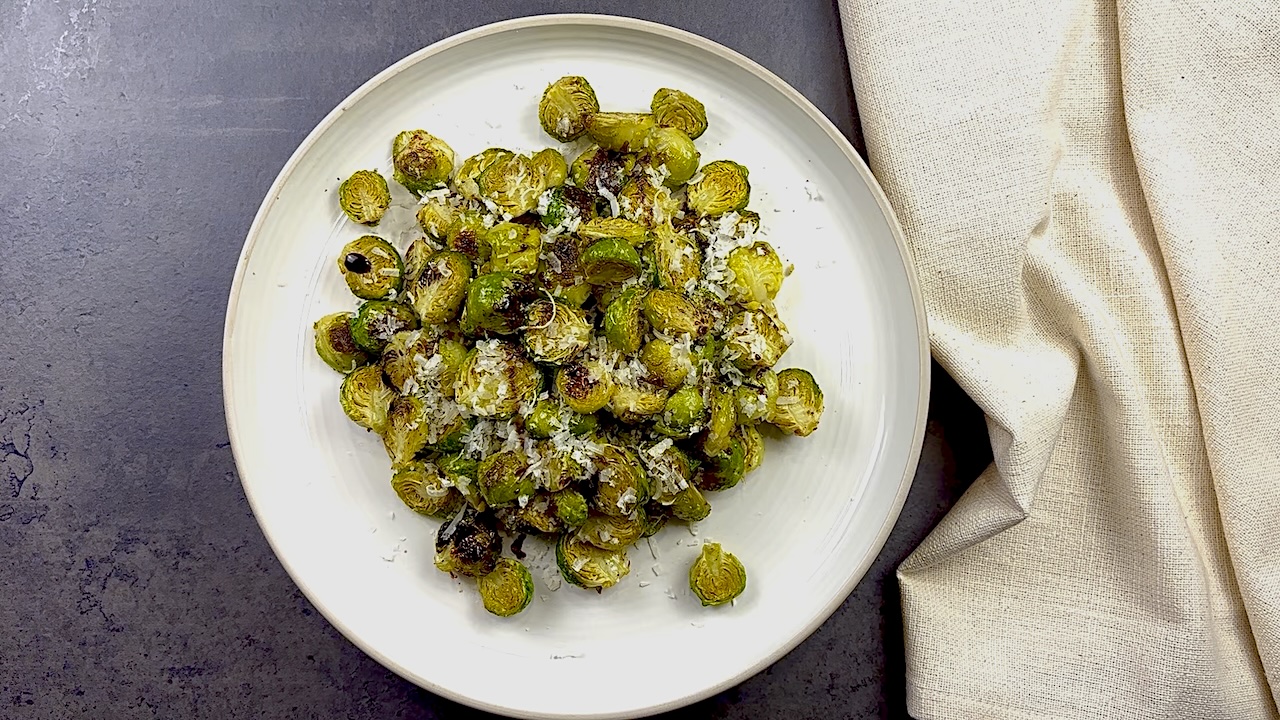 Drizzle the roasted Brussels sprouts with balsamic glaze then sprinkle grated Parmesan cheese on top while the sprouts are still warm.