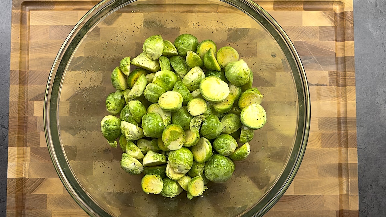 Toss the halved Brussels sprouts with olive oil, salt, garlic powder, and pepper in a bowl.