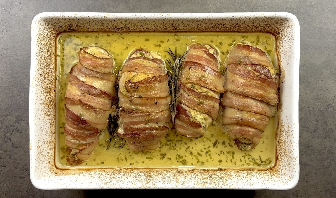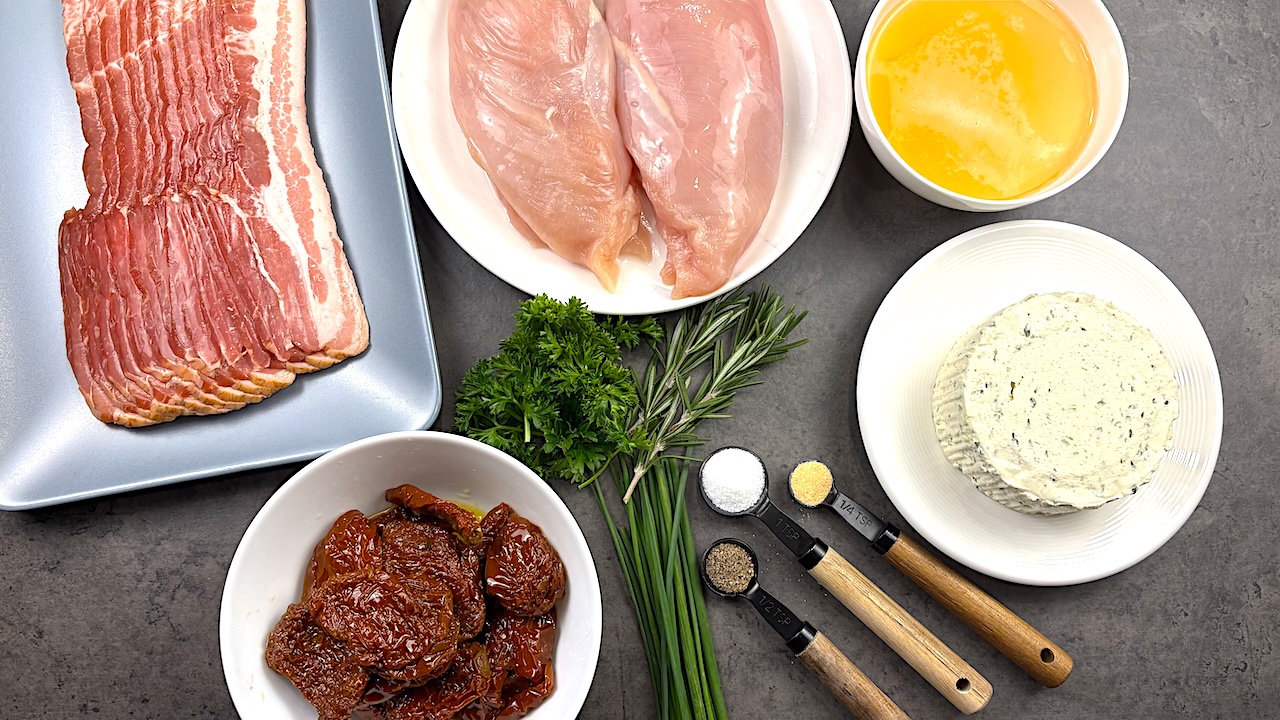 Chicken Breast in Bacon Rolls, a dish that combines tender, juicy chicken stuffed with creamy herb cheese and sun-dried tomatoes, all wrapped in smoky, crispy bacon. Infused with aromatic herbs and baked to golden perfection, this elegant yet comforting recipe is sure to impress your taste buds with every bite.