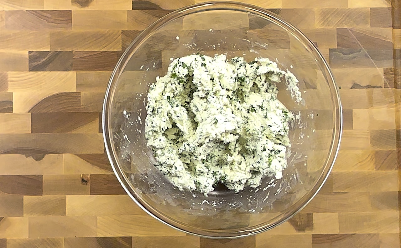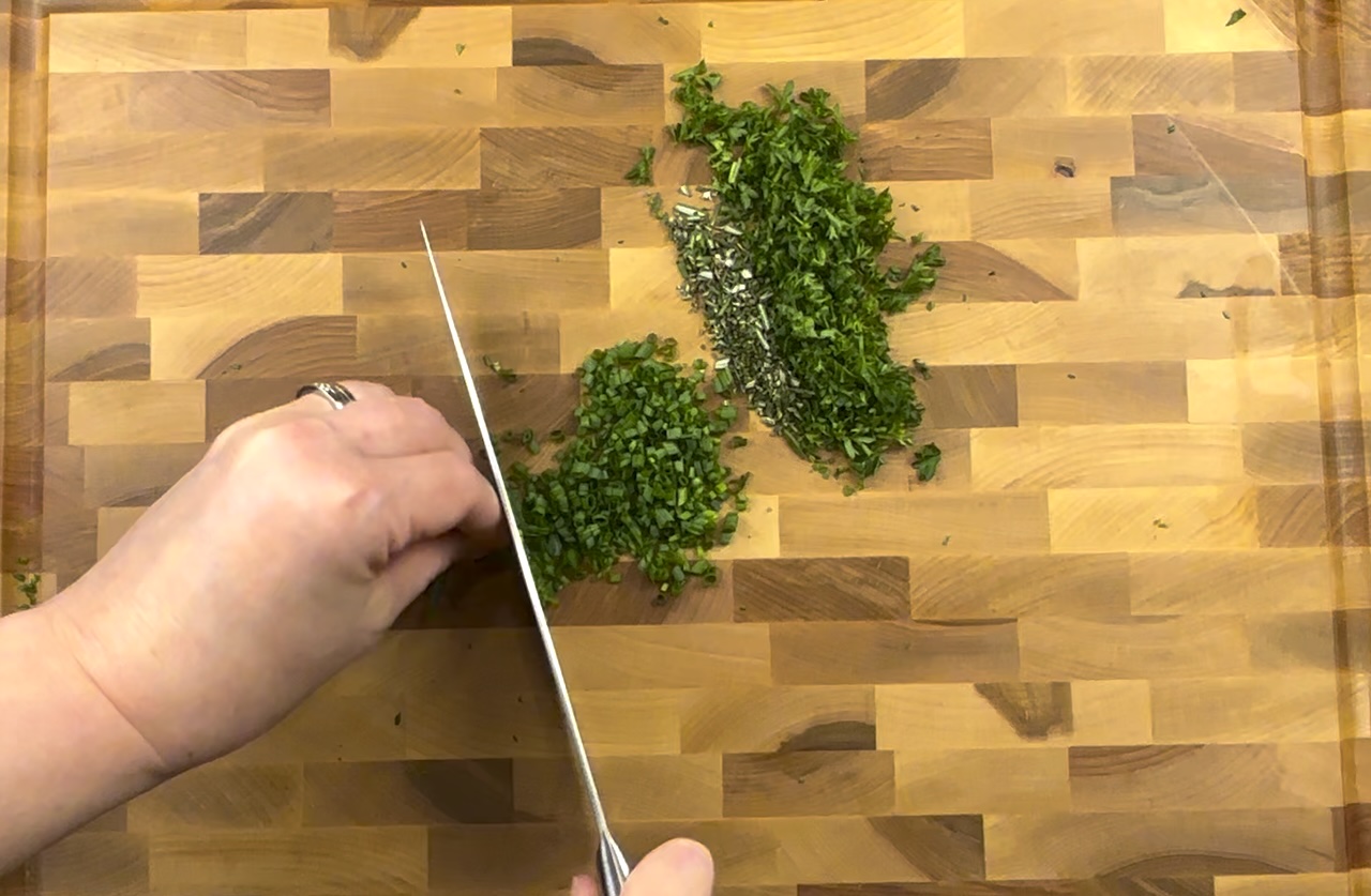 In a mixing bowl, combine the cream cheese with the chopped parsley, chives, and rosemary. Mix until evenly blended.