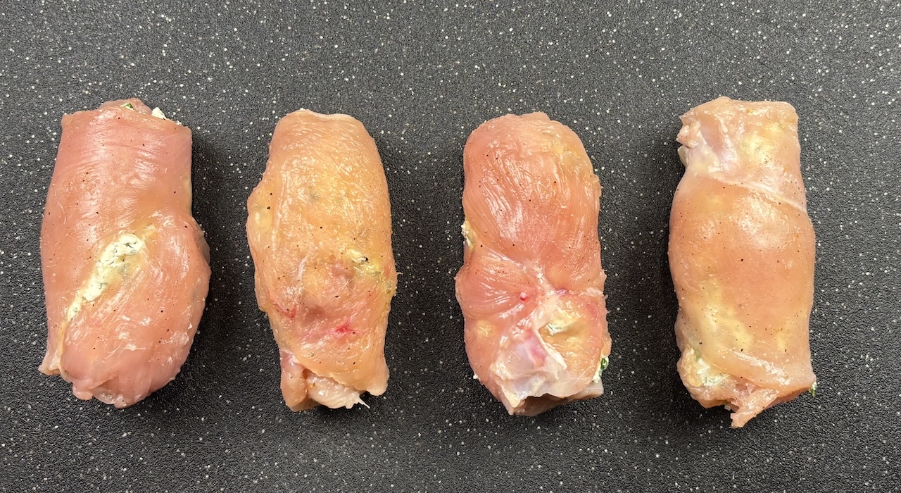 Carefully roll the chicken breasts around the filling to encase it completely.
