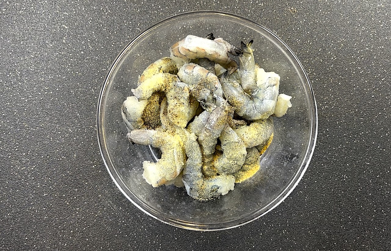 In a large bowl, combine the shrimp, salt, garlic powder, black pepper, and vegetable oil. Toss well until all the shrimp are evenly coated.