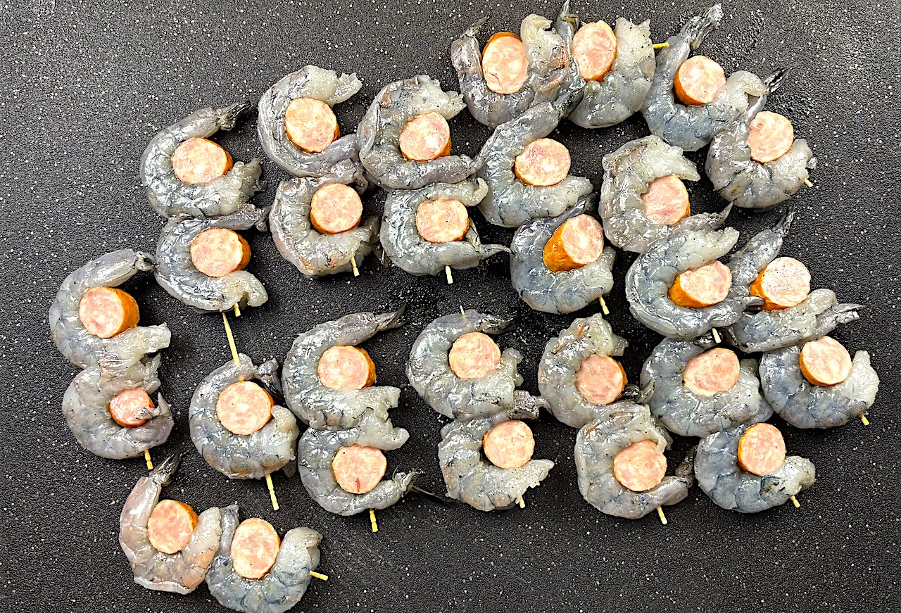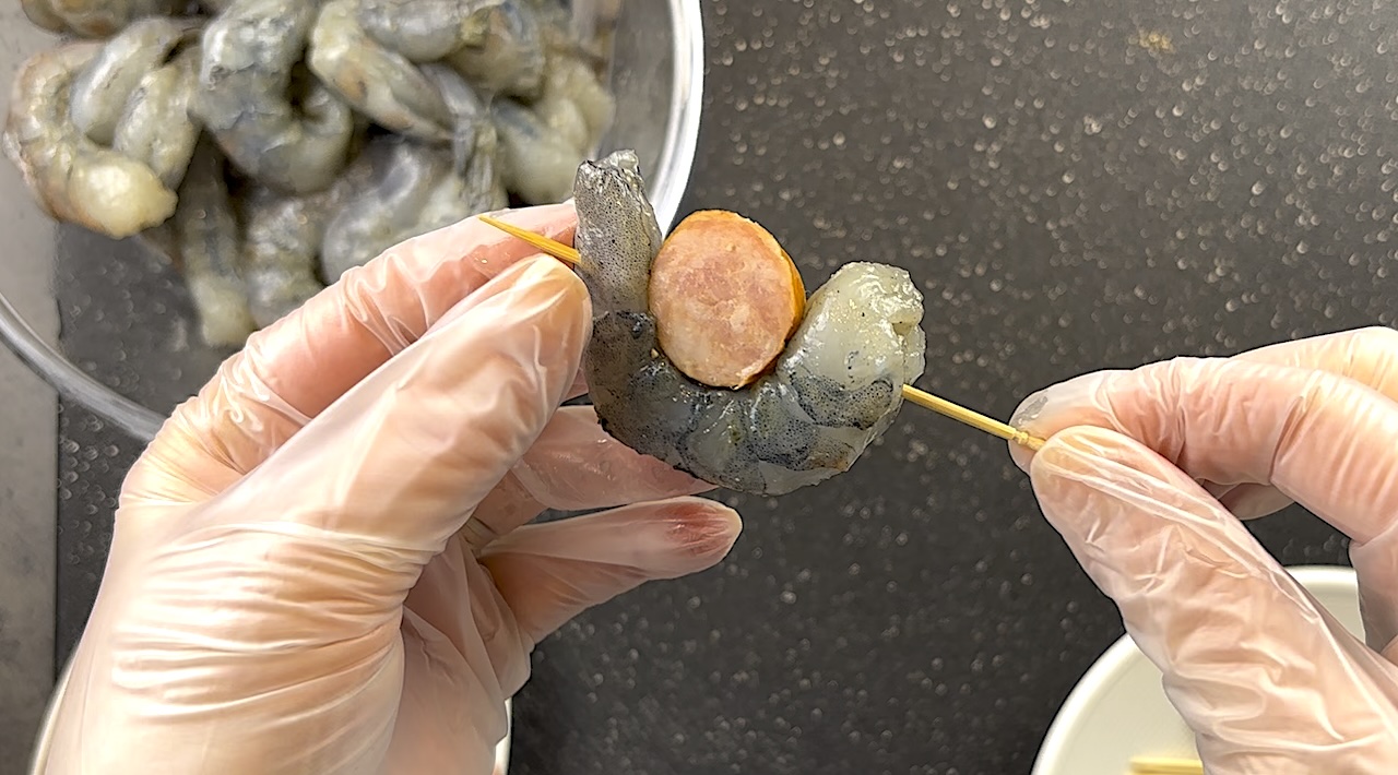 Use about 15 skewers, each 4 inches (10 cm) long. Thread one sausage slice between the curve of each shrimp onto the skewer. Aim for two shrimp and two sausage slices per skewer, but adjust based on their sizes. If fitting two shrimp is difficult, use one shrimp per skewer and double the number of skewers accordingly.