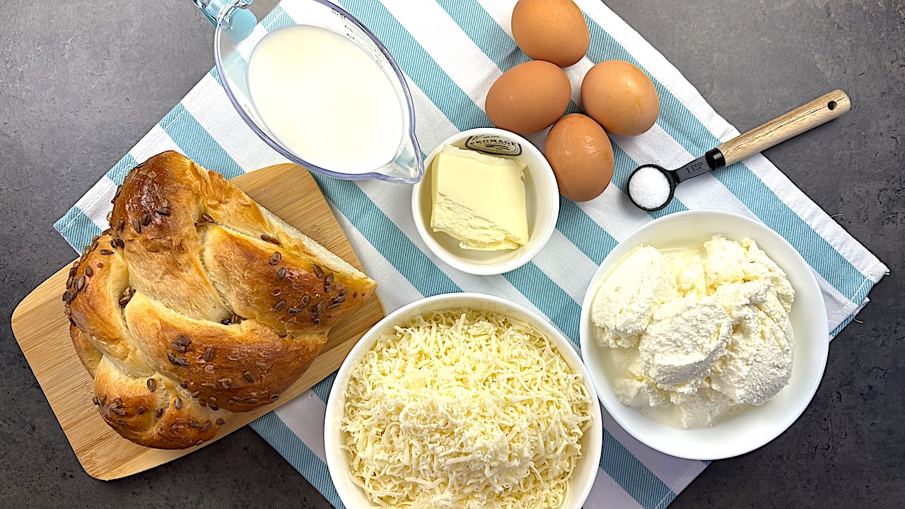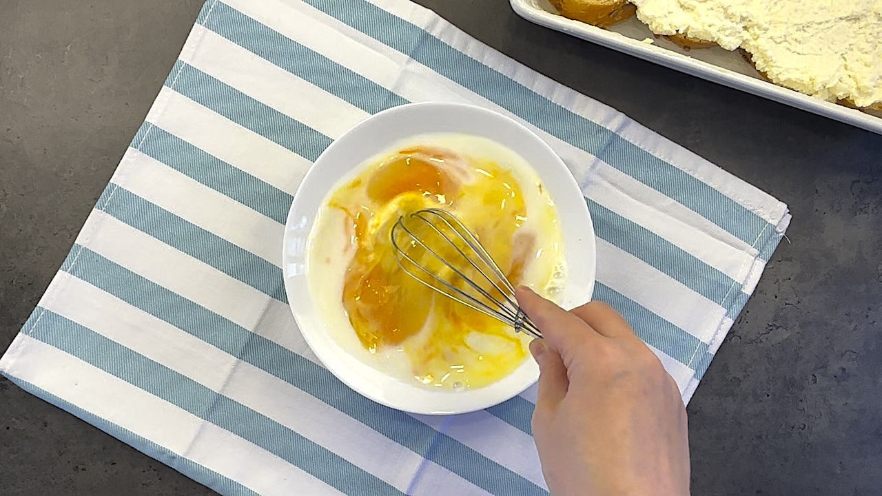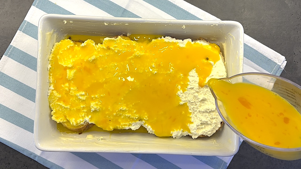 In a separate bowl, whisk the eggs with the remaining milk, then pour the mixture over the ricotta and bread. Ensure the egg mixture is evenly distributed over the entire surface.