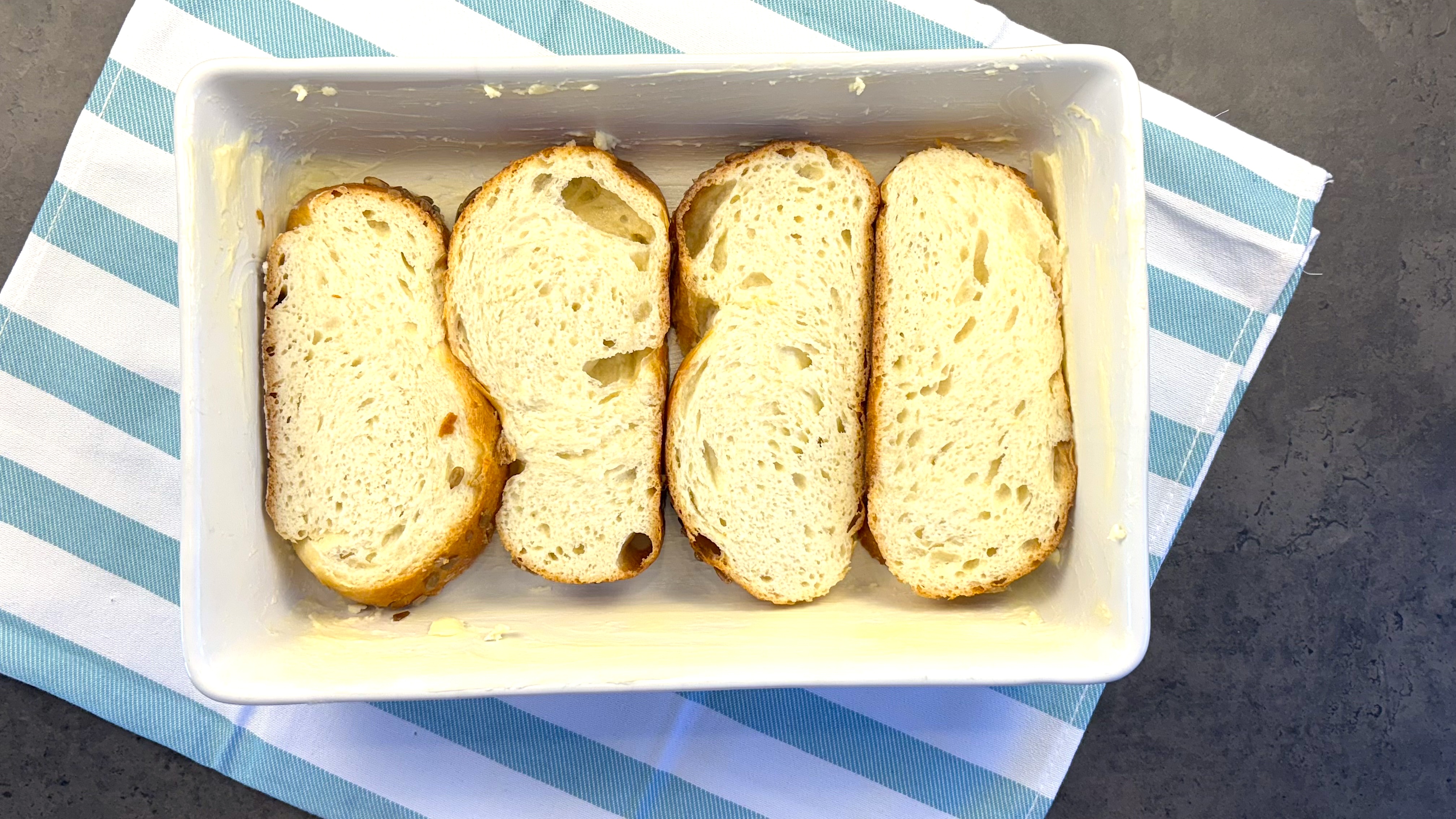Slice the leftover bread into 2 cm (about 1-inch) slices. Soak these slices in the milk and arrange them in a single layer in the buttered casserole dish.