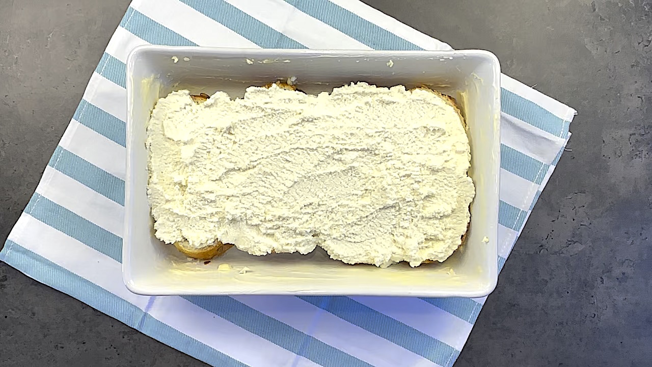 Layer the soaked bread evenly. Once you have a full layer of soaked bread, spread the ricotta cheese over it. Then, season with salt to taste.