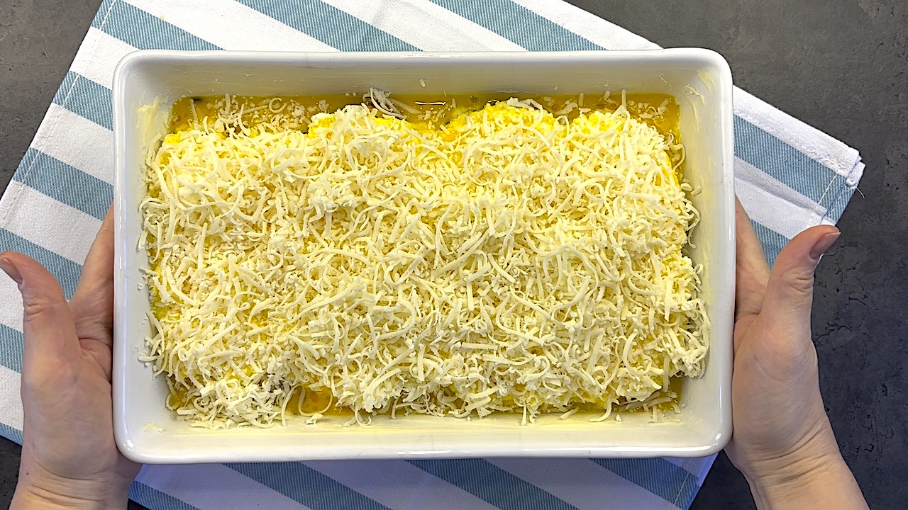 Grate the hard cheese (any type of hard cheese you prefer) and sprinkle it evenly over the top of the casserole. Then, place it in the preheated oven and bake for 30 minutes, or until the casserole is set and golden on top.