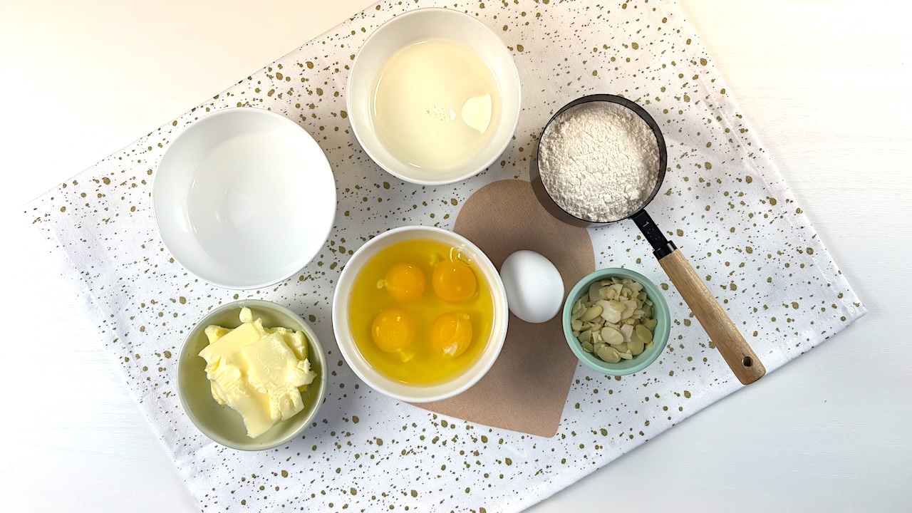 - 150 g eggs (about 3 large eggs) + 1 egg for egg wash