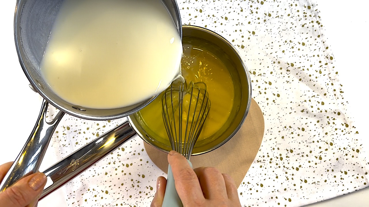 Slowly pour the hot milk into the egg mixture, whisking continuously to avoid curdling.