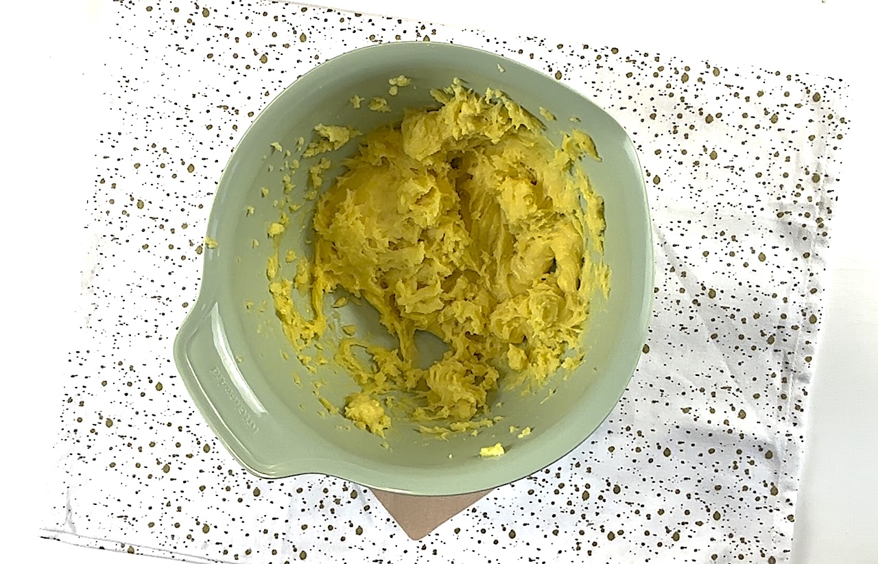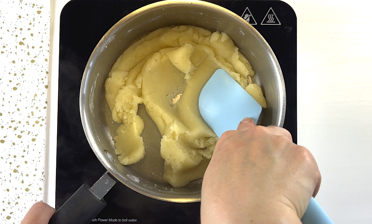 Once the mixture comes to a boil, add 120 g of flour all at once, stirring vigorously. Continue to mix until the dough comes together, and forms a smooth ball that sticks to the bottom of the pan. Keep stirring for another 2-3 minutes to ensure the dough dries out slightly and the flour is fully incorporated.