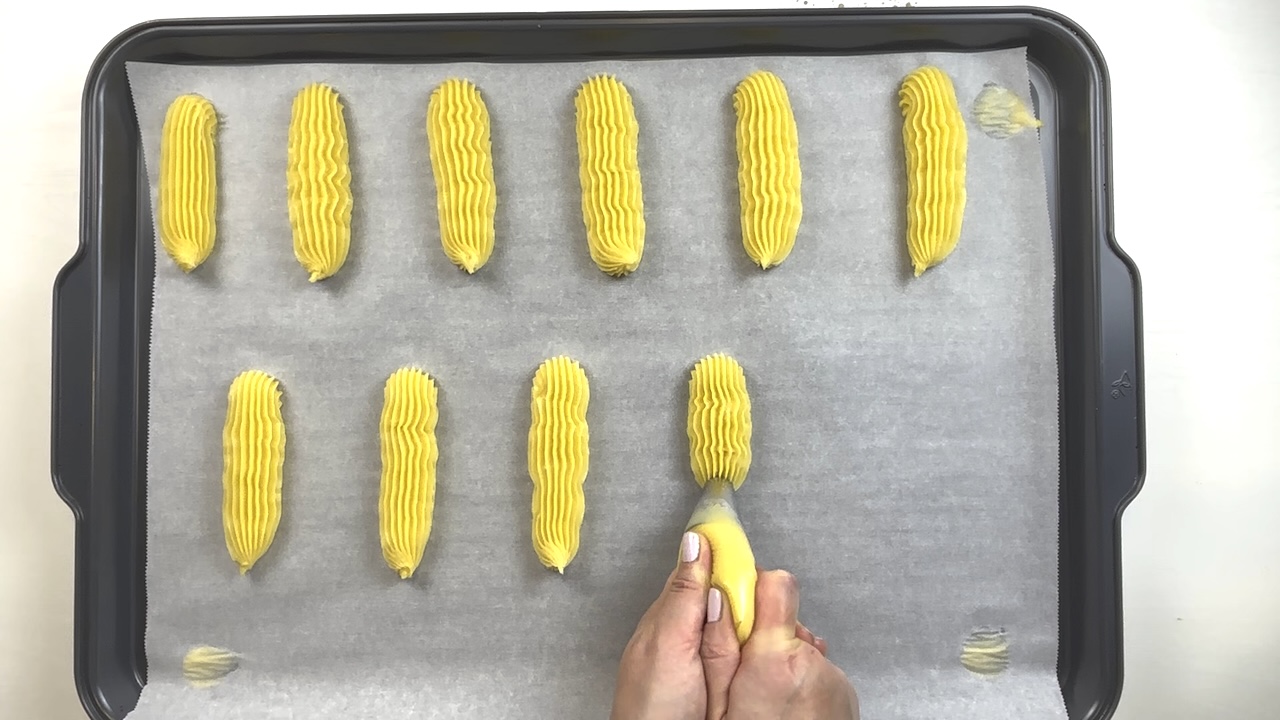 Transfer the dough to a piping bag, pipe 1 1/2×4-inch strips onto the baking sheet, brush with egg wash, and sprinkle with almond flakes.