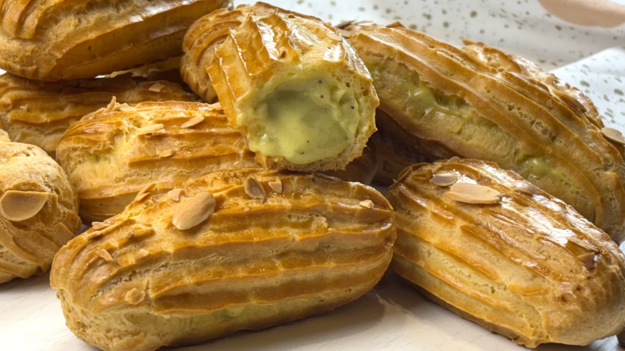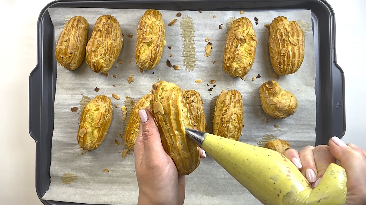 Once cooled, pipe the pistachio cream into the center of each éclair. Serve immediately, or refrigerate until ready to enjoy.