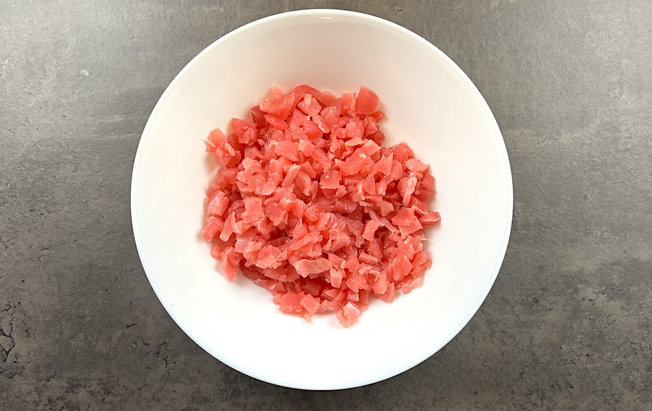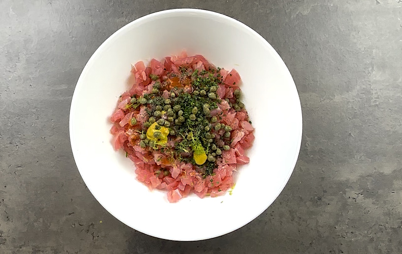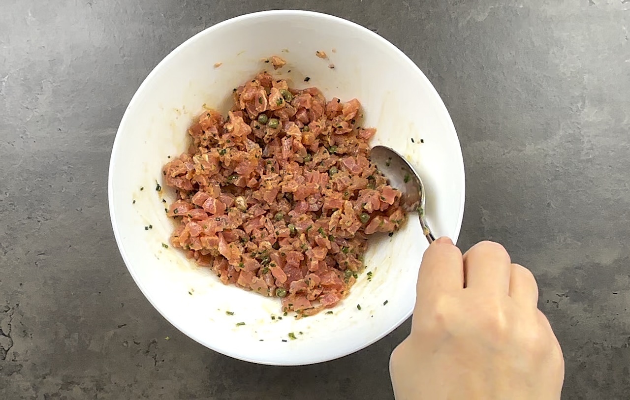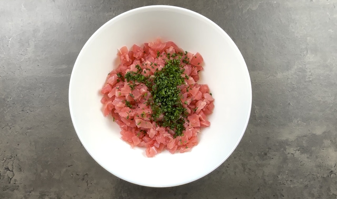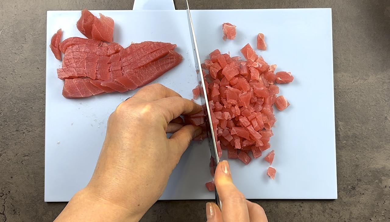 Dice the ahi or sushi-grade tuna into small cubes and place them in a mixing bowl. Keep the tuna chilled until you’re ready to prepare the tartare.