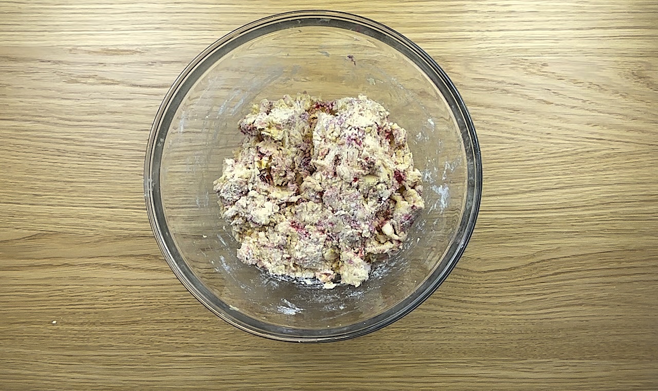 Add the frozen raspberries and carefully fold them into the dough. Try to mix as little as possible to prevent the berries from melting or breaking apart too much.