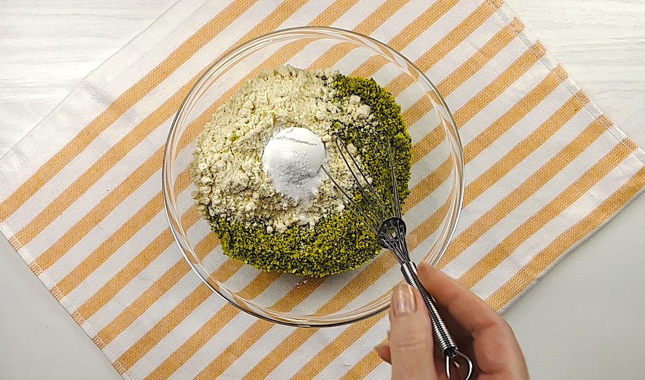 In a separate bowl, whisk together the pistachio flour, coconut flour, baking powder, and salt.