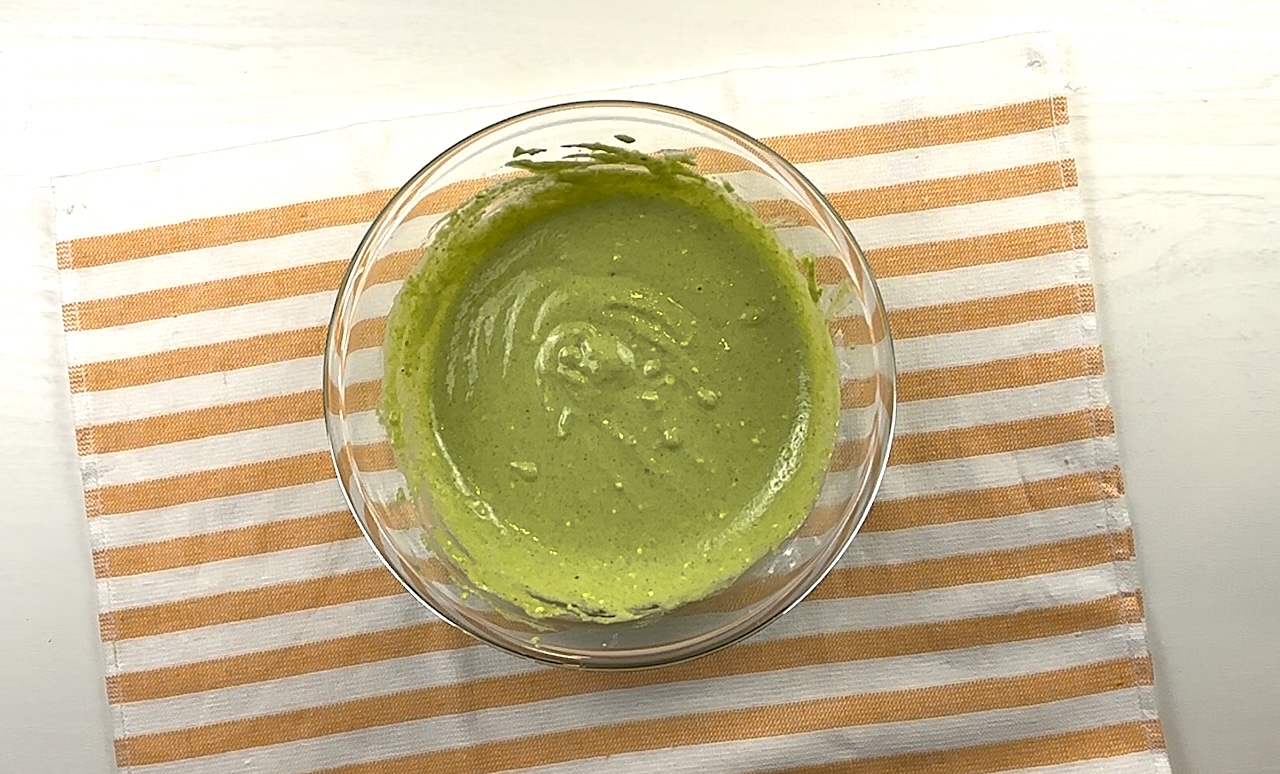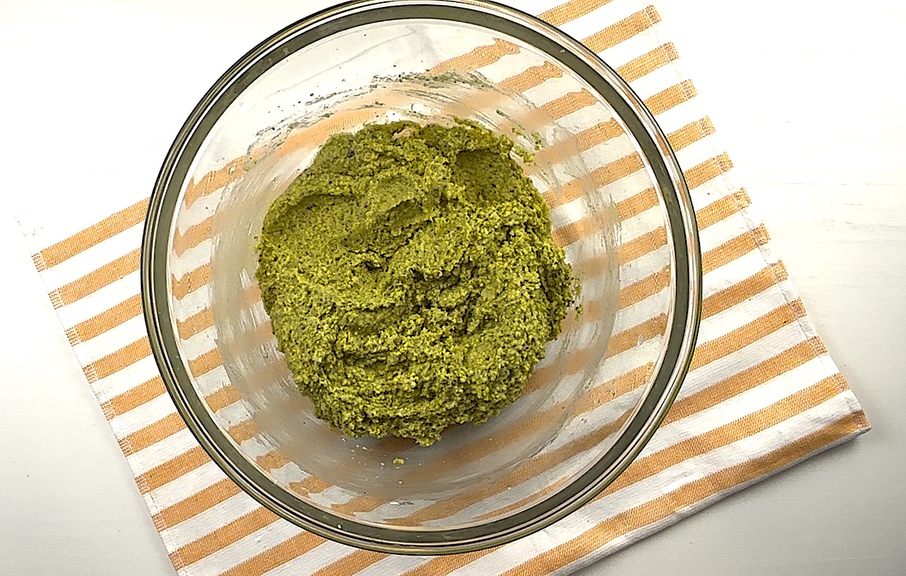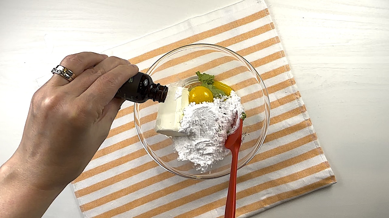 In another bowl, beat together the cream cheese, pistachio butter, egg yolks, Swerve, and pistachio extract until smooth and creamy. A hand mixer works best for this step.