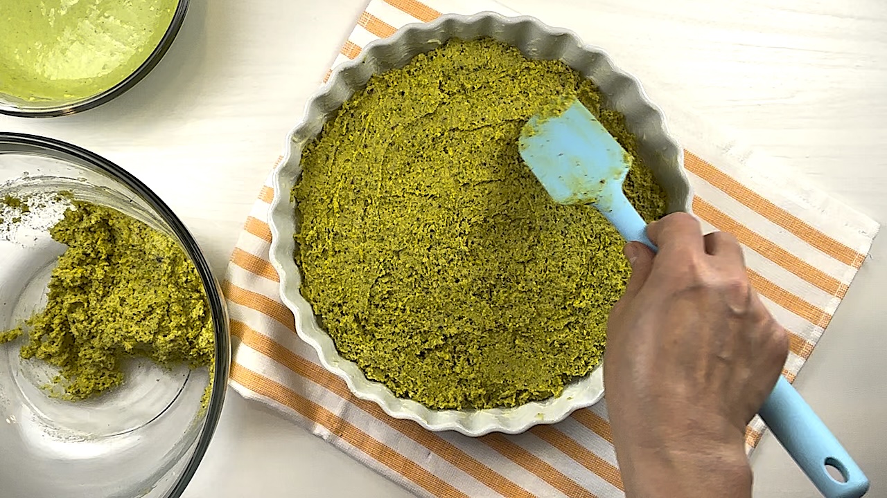 Spread about 70% of the pistachio batter evenly across the bottom and sides of the greased pan.