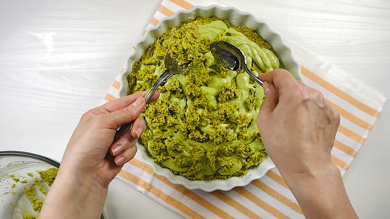 Pour the pistachio filling on top and spread it evenly.